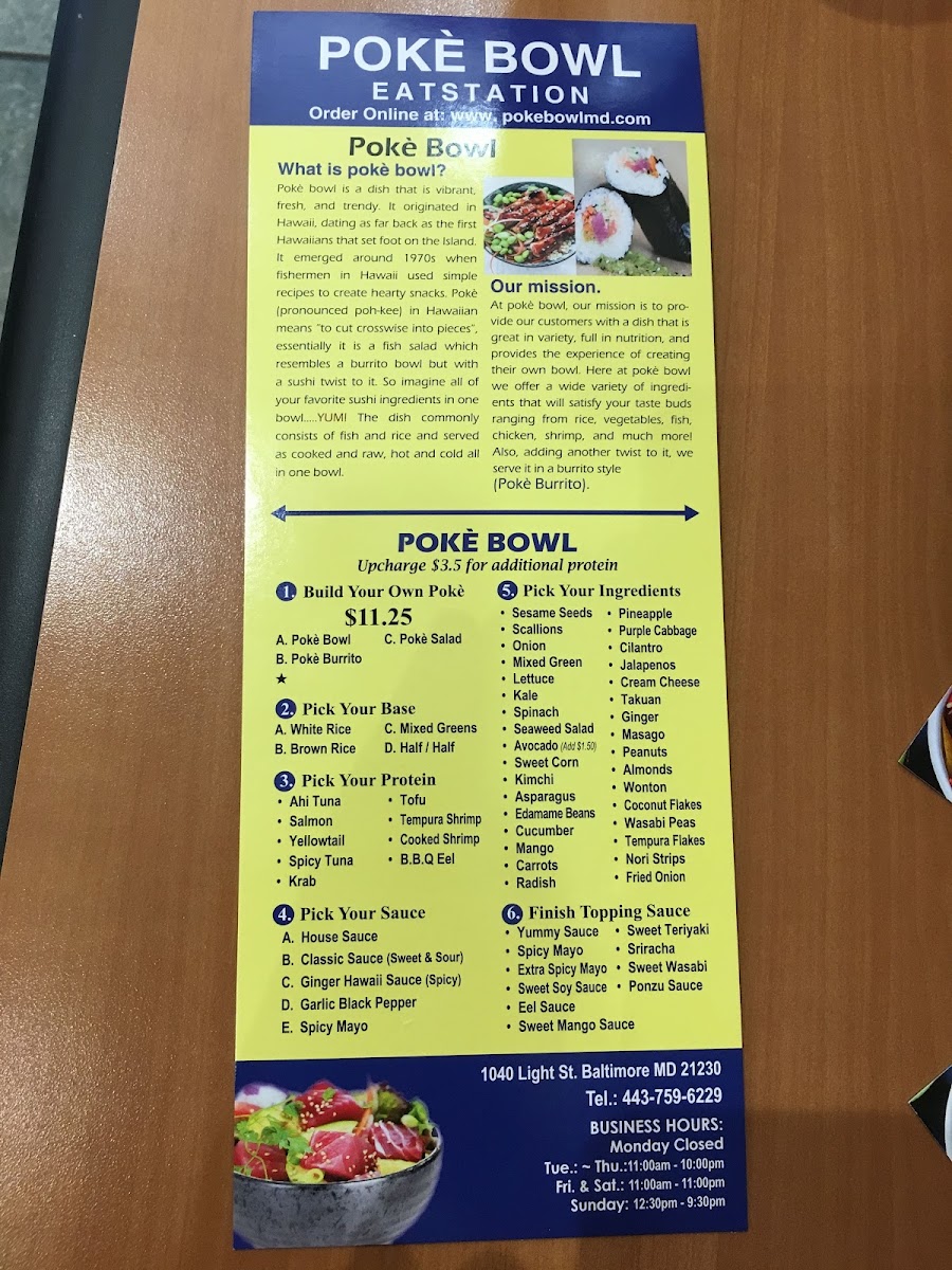 Poke Bowl - Federal Hill offers a fresh and vibrant Hawaiian dining experience right in the heart of Baltimore. Their menu shines with customizable options, inviting you to build your own poke bowl or enjoy a sushi burrito wrapped in seaweed and rice, both priced at $16.75. The variety of sauces—from Spicy Mayo to Sweet Mango and Garlic Black Pepper—elevates every creation with bold, nuanced flavors.